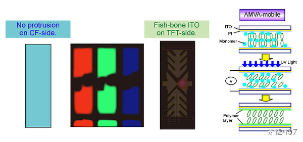 左邊為AMVA 右邊為一般VA(在傳統MVA的技術中, 暗態漏光最大的來源來自於protrusion; AUO新一代的AMVA使用最新的PSA  (Polymer-StabilizedAlignment) 技術 ,將傳統MVA技術中CF的protrusion移除,可大幅度的改善暗態漏光。所以暗部可以極暗,同樣亮度下達到優秀的對比。)