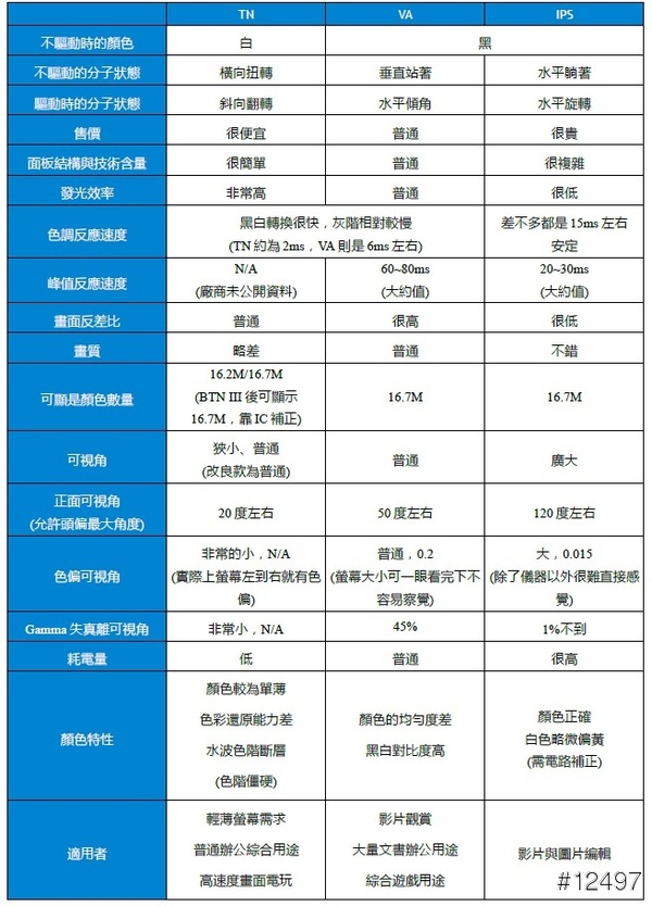 ※這是現在的面板差異,就用途來看一般人使用VA是最適合,除非預算不足才選TN,然後專業用途才會去選高階IPS(還要準備一筆矯正色器錢)。