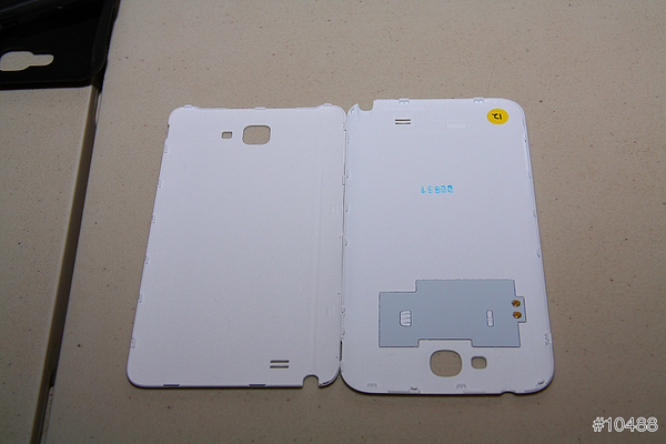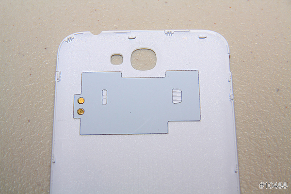 NFC 晶片位於背蓋內側上半部,上面兩個圓圓銅接點是對應NOTE 2 micro SIM卡槽旁邊兩個連接點,跟GALAXY NEXUS配置在電池上面不一樣