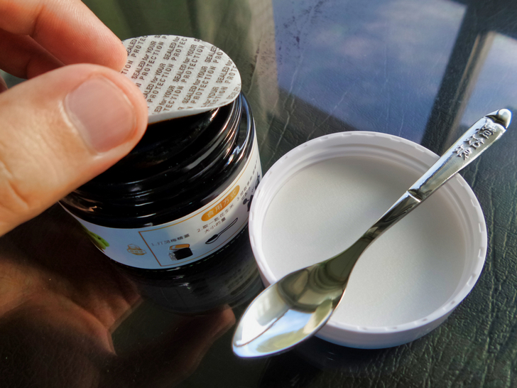 ▼ 梅精的食用方式,首先打開梅精上外蓋,以內附湯匙取一匙花生米大小的量,最後挖取享用,若覺得太濃可配水來稀釋濃度。