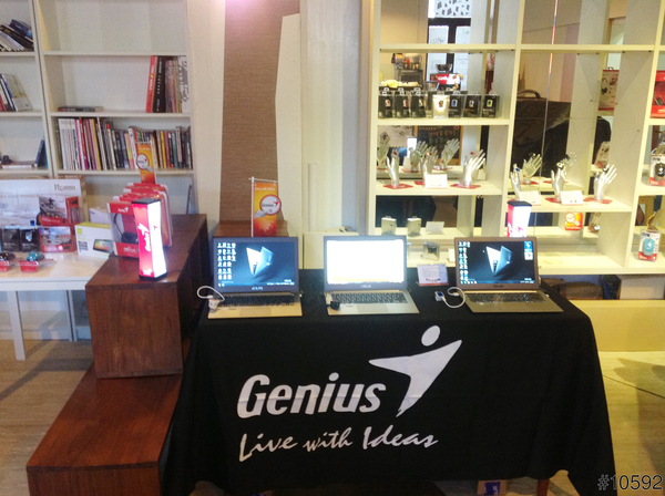▼入口處的陳列區,擺放著展示用的筆電與本次的主角"指環式簡報器的真身",主辦單