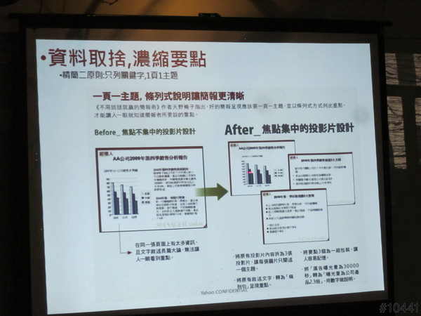 就是在簡報頁面中不要放入太多文字,放太多字聽的人沒興趣,講的人可能會照稿念那整個氣氛可能會很冷,只要放些重點文字或數字吸引注意即可,也可增加一些臨場的反應