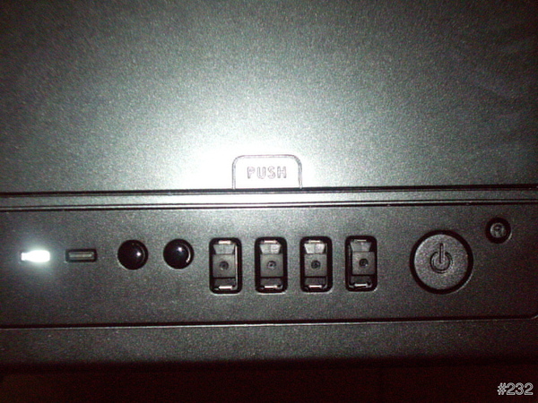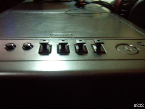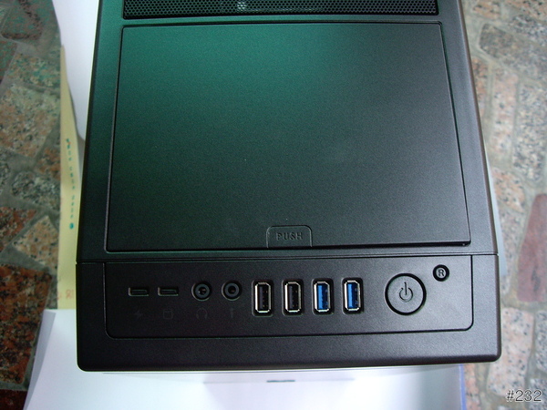 ▲機殼上方的前面板,由左到右依序為:Power LED、HDD LED、耳機、麥克風、2個USB 2.0 Ports、2個USB 3.0 Ports、電源開關、重置鍵。