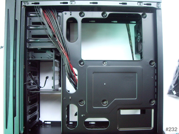 ▲機殼的背板,它的CPU 開孔非常大,讓你拆裝散熱器不用移除主機板,多處開孔也使得整線更方便,走線空間至少1.5cm以上,線材隨便整理也可以輕鬆闔上(≧▽≦)