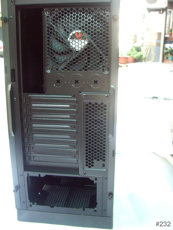 ▲機殼的背面,搭載原廠自家的12cm風扇,3個水冷孔位以及7個介面卡擴充槽檔板,檔板可重覆使用,電源採下置式安裝,Power 風扇要朝上或朝下安裝均可。沒有問題。