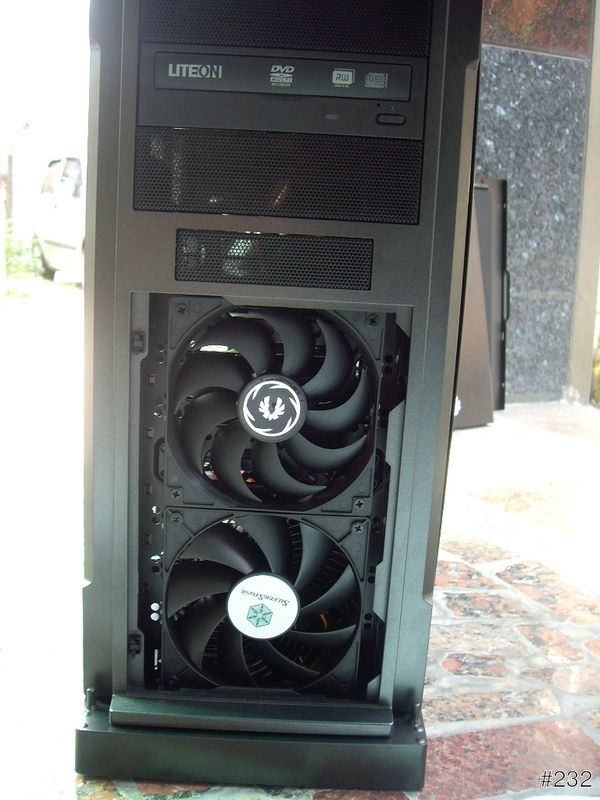 ▲卸除門板以及前機殼濾網後可以看到前方支援2顆12cm風扇或1顆14cm風扇,出廠預載1顆12cm的火鳥風扇,下方那一顆則是我另外買來加裝的風扇。