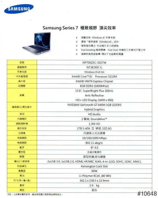 極窄邊框, 強效電力8小時續航, 極速開機, 高解析高亮度螢幕, Samsung Series 7包括外包裝內附VGA 轉接頭,可外接大螢幕; 右側邊機身裝設了薄型吸入式光碟機 SuperMulti ,及配置一個USB2.0的連接埠, 適合常需至客戶處做簡報或出差在外的業務人士使用