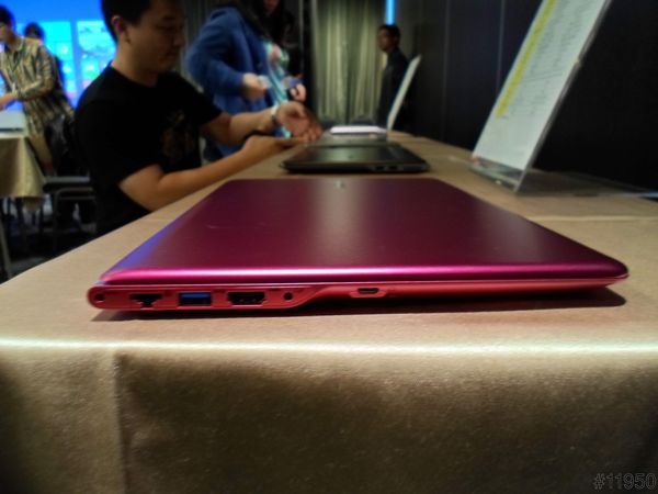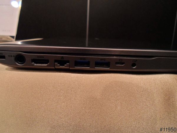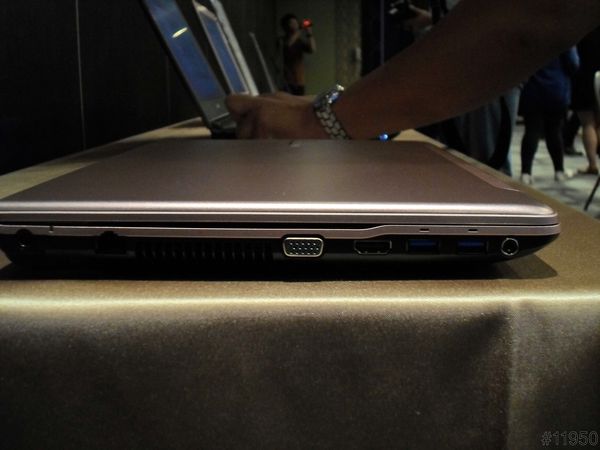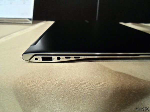 ▲機身左側分別是:電源輸入孔、USB 3.0、耳麥孔、迷你HDMI、RJ-45、音源接收孔,因為厚度關係網路和螢幕輸出軌是用轉接的