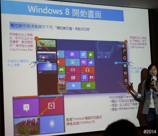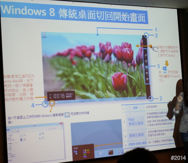 Windows 8提供了開始畫面(動態磚)和傳統桌面兩種介面,Michelle對開始畫面(動態磚)裡一些重要的項目,進行說明。