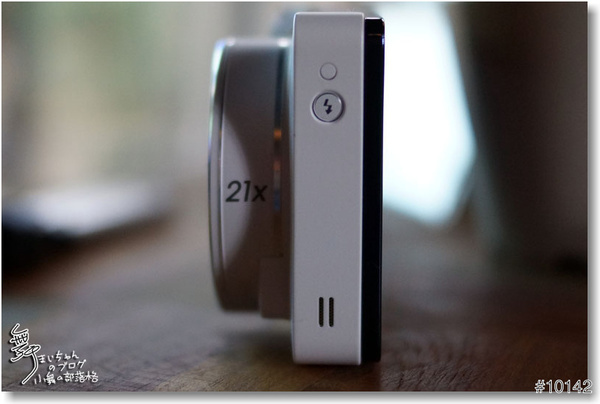 ▲左視圖:一個閃光燈鍵和喇叭孔;另外也可看到凸出的鏡頭座標示著21X變焦倍數