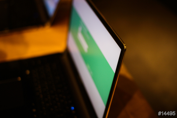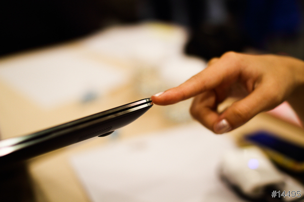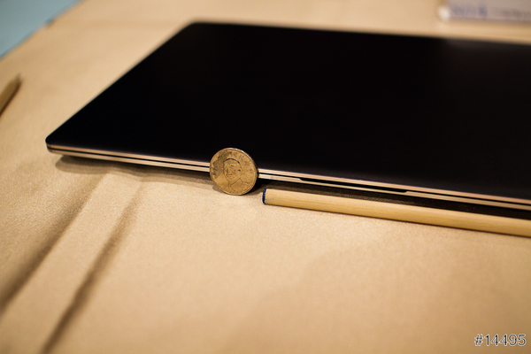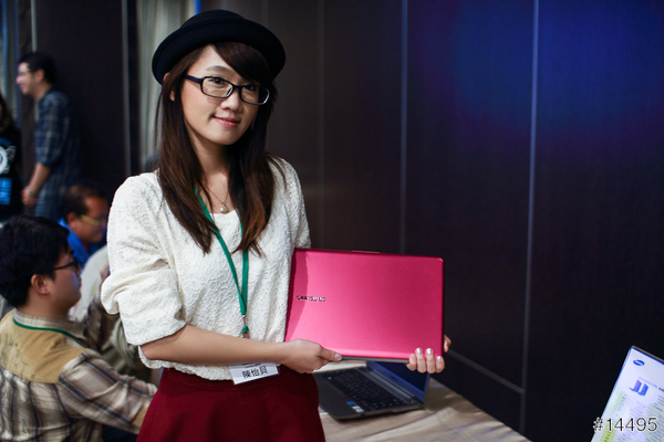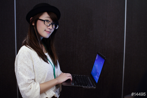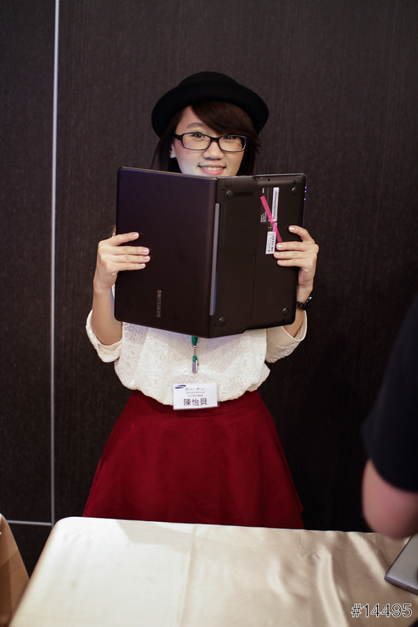 報到完剛到座位上放下包包外套,我立刻見獵心喜的找到了最輕薄的Series 9。瞧瞧!我只用單手就輕易的把它舉起囉~別懷疑!並沒有黑衣人在後面幫我偷撐XD而且雖然只是單手撐起筆電,卻也沒有偷偷發抖喔~任憑我的攝影師在那邊左喬喬光圈、右調調快門,我的手還是穩穩的托著輕薄時尚的Series 9,只是不能避免的我還是翻了翻白眼╮(╯_╰)╭