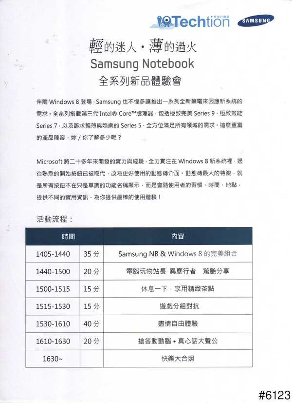 難得的休假日來到莉蓮會館卻碰上陰雨天,著實令人感覺天氣的多變,幸好搭捷運有趕上主辦單位所指派的接駁專車,才不致於缺席今天的WIN8筆電發表會,不然就囧rz 回到今天的主題 三星筆電全系列新品體驗會 在里仁廳舉辦活動 會場已經準備就緒 趁活動還沒開始前先來體驗一下各系列的筆電吧 都關燈要開始了大家還是再硬撐到最後一秒,就是要先體驗啦╮(╯_╰)╭ 今天三星筆電的美女代表<( ̄︶ ̄)> 下午的活動流程,真得滿緊湊的喔(⊙ˍ⊙) 開始前先來一段江南STYLE輕鬆一下,跳個騎馬舞,不然等一下要連坐兩個多小時吧 研究報告顯示坐得越久,壽命越短 別傻了,結果當然是沒有人跳啊,直接跳進主題吧 讚 收藏 快速回應 引言回應 共 1 則回應 1 樓 · PCABC · 發表於 2012-11-29 00:34 · 檢舉 引述《Leon》之銘言: > ,,,,,,,,,,,,,,,,,,,,,,,,,,,,,,,,,,,,,,,,,,,,,,,,,, 只打一行? 你這也太................... 讚 引言回應