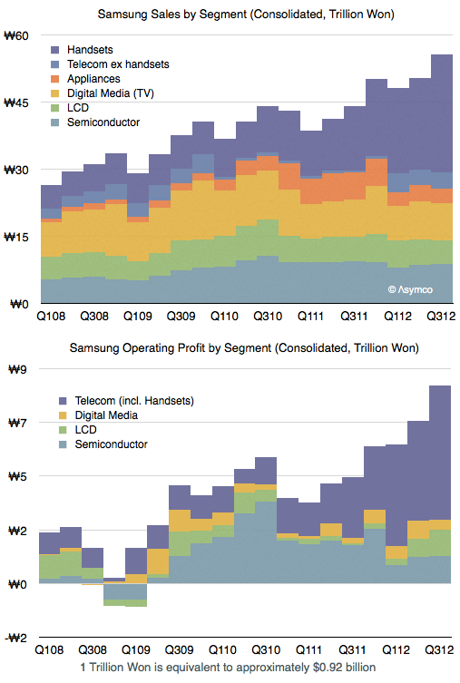 而 Asymco 也指出,與快速成長的行動裝置業績以及行銷費用不成比例的,是三星目前手機部門的營利率僅從 2007 年的 11% 上升到現在 17%,這個數字以一個智慧型手機龍頭大廠來說並不算高,黑莓機最好有 30%,HTC 是 27%,Nokia 25%,而 APPLE 更是高達 45%。