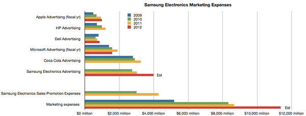 當一個公司想要塑造品牌時,行銷費用控管就是一個大問題。過去在行銷費用上花大錢的以可口可樂、APPLE、微軟等公司著稱,但在今年,三星以 40 億美金的數字超越了這些公司,成為了今年的「行銷花費」第一名。
