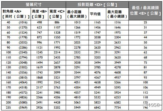 ▲附上投影各尺寸需要的最大和最小距離(此圖來源BenQ官網)