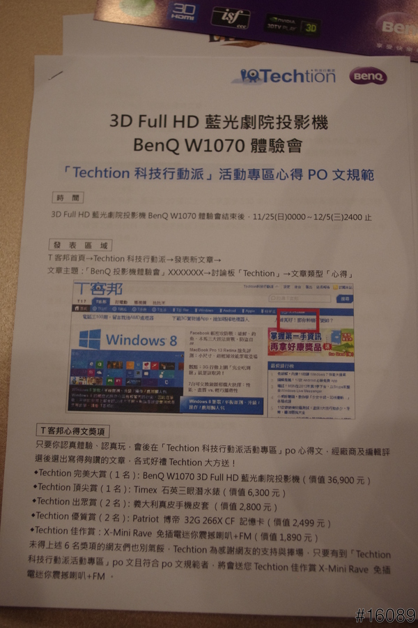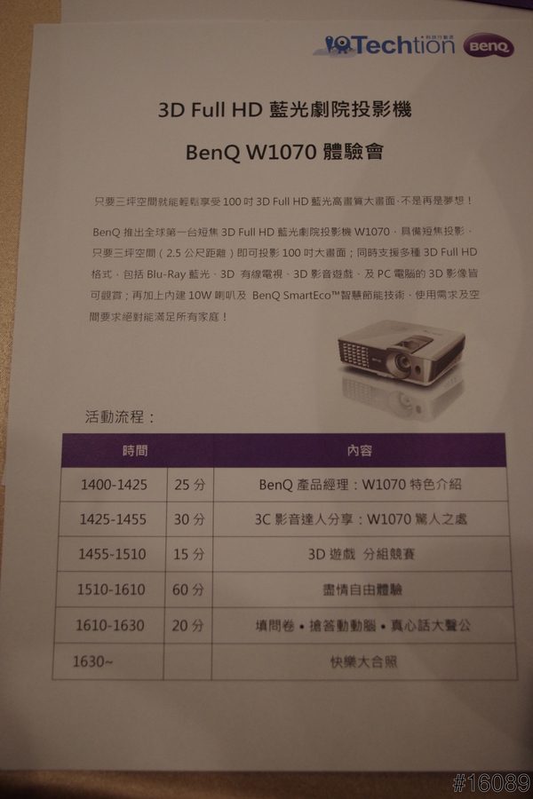 很榮幸能有機會來參加這場BenQ跟T客邦所舉辦的W1070體驗會,讓我有機會能實際體驗到W1070驚人的3D視覺震撼,雖然機身只有小小一台卻能夠完全展現3D FULL HD的高投影品質以及高達2000ANSI流明效果,搭配著內建10W喇叭及BenQ SmartEco的智慧節能技術,且打著只需三坪空間便能投影出100吋以上的大畫面,種種高規格技術使得BenQ W1070真的是台灣的另一項世界驕傲阿!!!