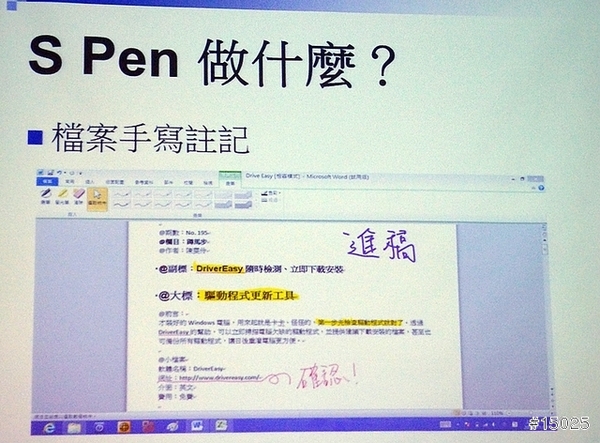 ▼陳雯伶小姐:談到三星ATIV smart PC,就一定要說說SPEN的功能,不僅手寫輸入外,更可以在MS OFFICE中相容使用!