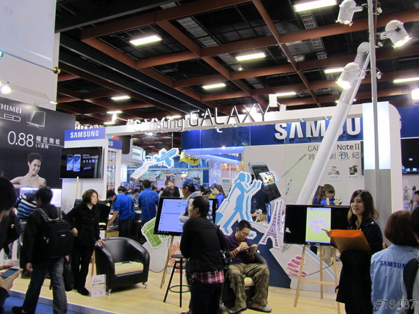 ▲來到這邊也要來去看一下,下午參與體驗會的廠商 Samsung 的展場,規劃的相當完善,前方搭配手寫功能而邀請三位插畫家現場揮毫一番,中後方為新品手機相機體驗區,右方為體感電視區,熱心的服務人員皆都熱誠的為現場民眾解說。
