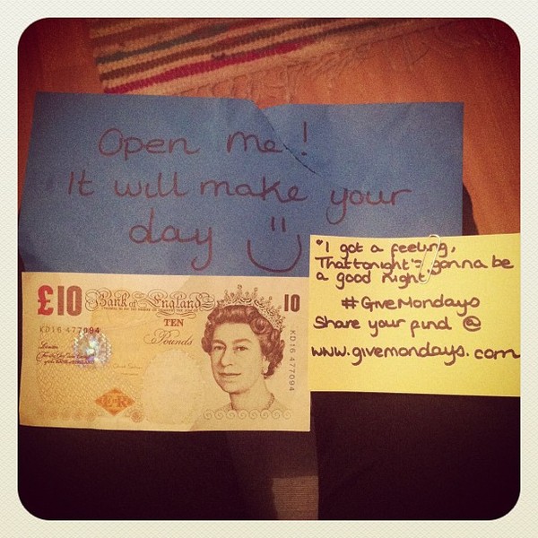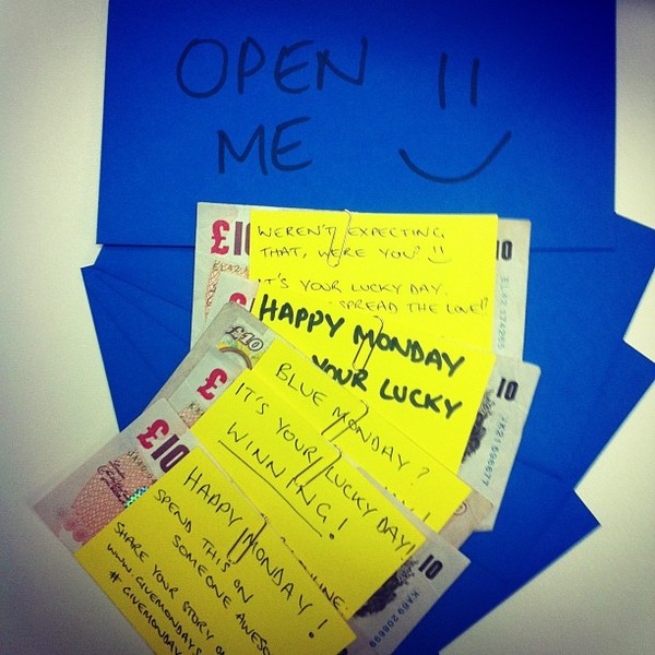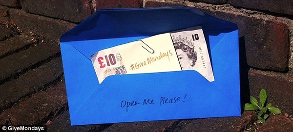 英國就有一群有錢又好心的人利用一種特殊的方法,要來幫助人們在周一改變心情,他們將一張10英鎊紙幣和一張慰問紙條放進一個藍色信封,隨機塞給路上的路人。這個好心的