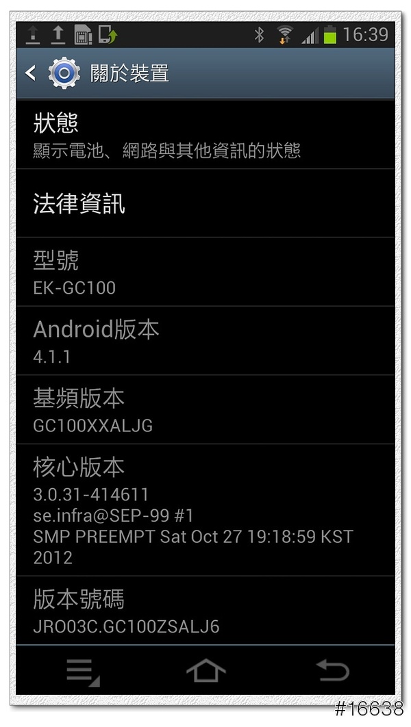 14. 確認作業系統版為4.1.1,機型則為EK-GC100,若之後有看到小弟的照片右下角有標註EK-GC100的訊息即為Galaxy Camera所拍攝~~