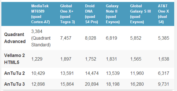 ▲ MT6589 與他廠四核心跑分軟體分數相較列表。(來源:engadget)