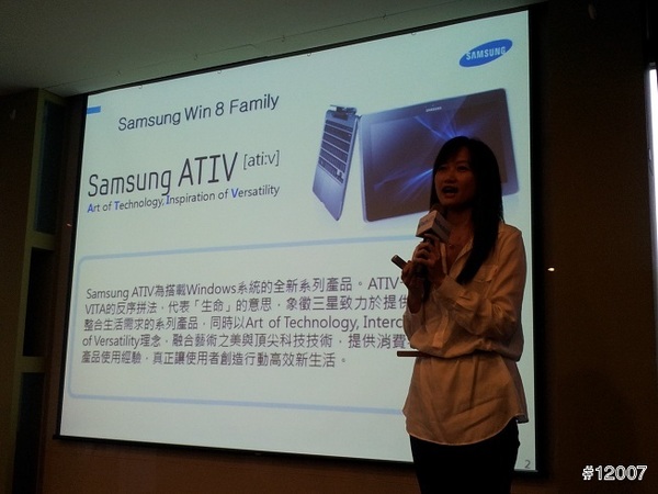 主持人是Techtion科技行動派小編JOHNNY帥哥,帶領大家進入Samsung ATIV smart PC的活動,接著由Samsung產品經理Michelle小姐,來介紹主角Samsung ATIV smart PC,ATIV是由Art of Technology , Inspiration of Versatility ,的英文字首來取名的,非常有創意的命名。