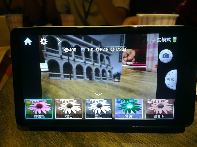 除了以上三種模式以外,另外最下方還有個選單,往上一拉,就會出現濾鏡選單。Galaxy Camera也在無效果以外,還提供了13種濾淨效果。如同下方所呈現的。