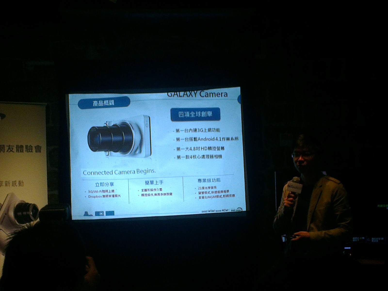 這裡也簡單的提了一下這台的特色。不外乎是具備類單眼的專業、同時也具備了智慧型手機的功能性(規格上和Galaxy S3相當),再加上3G/Wifi、開放式作業系統,結合成這台Galaxy Camera。
