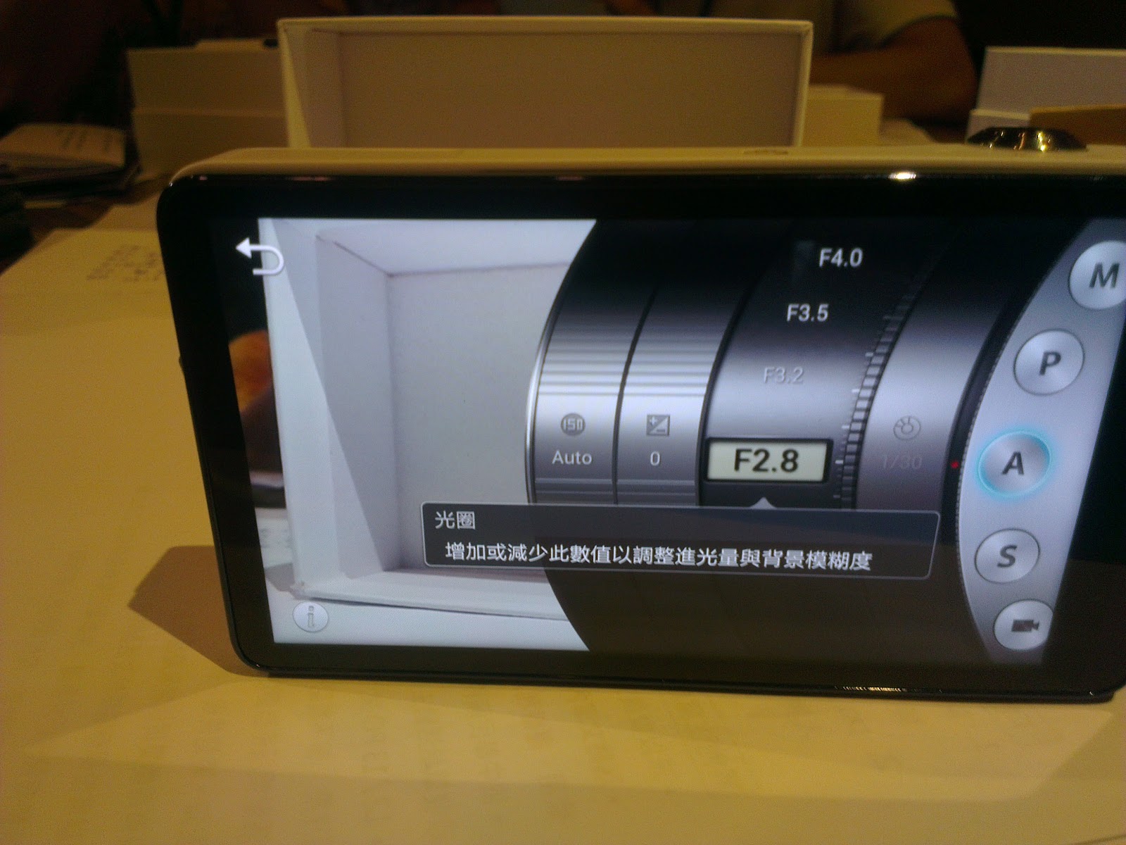 另外一個則是專業模式。在專業模式下,會出現一個類似鏡頭的圖示,可以在上面選擇你想要的功能。例如以下這張照片就是在光圈先決的狀況下,可以藉由旋轉模擬鏡頭的方式,來調到自己想要的數值。