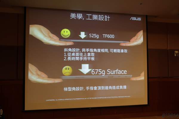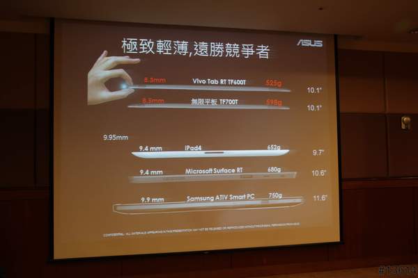 ASUS這次的產品薄度更是比其它牌產品要來的更輕更薄,從圖中我們就可以看到,雖然ASUS的TF600是10.1吋的,但是卻做的比它牌9.7吋的平版要來的更輕,而此可見ASUS這次平板