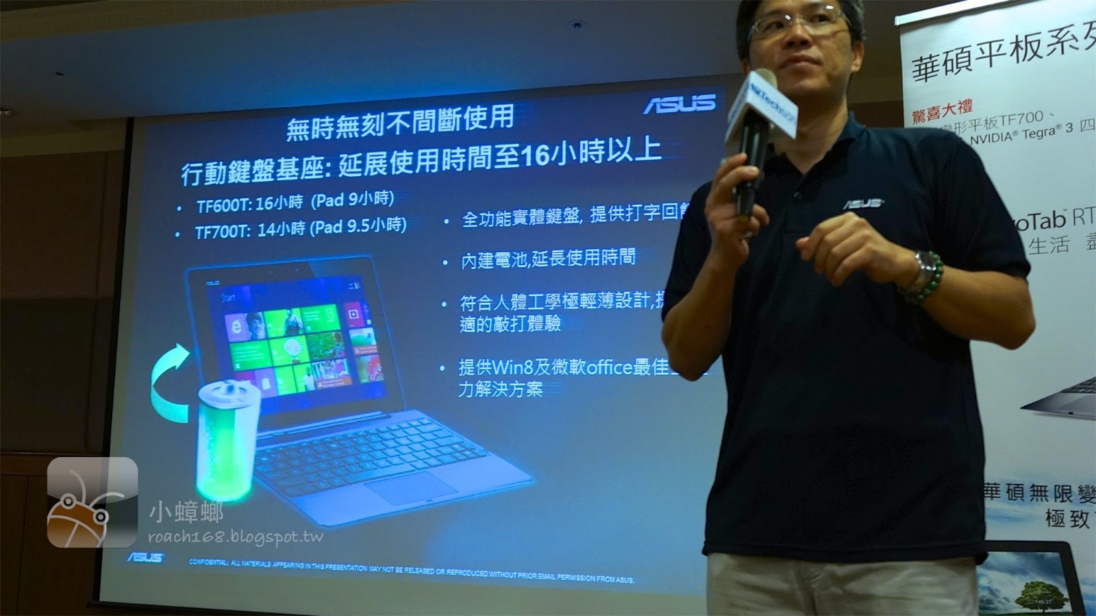 至於續航力來說,本身TF600T和TF700T各有9小時和9.5小時的使用時間,如果加上底座又會增加不少的使用時間,但相對地,攜帶的重量也變重囉