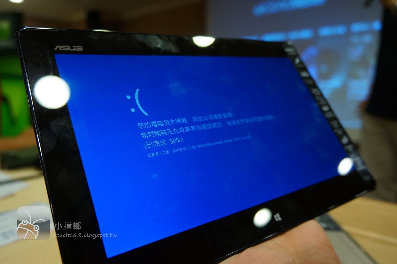 還有Windows一定要有的特色就是這個藍色經典畫面,不知道為什麼好像執行到什麼部分,就當掉了,看來廠商還要回去調整一下吧,不然用平板也常當機的話,會很囧的