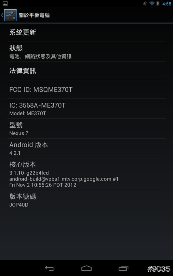 ▲ 原生的 Android 4.2.1 ,Nexus 系列一大吸引力就是之後的升級部分,完全不用擔心無法升級的問題。