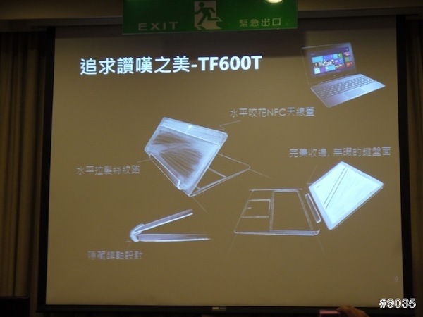 ▲ 先登場的是TF600T,先從他的外型設計在特殊的地方做說明,那個髮絲紋路實機看來其實真的滿特別的,拿起來的質感相當優異。