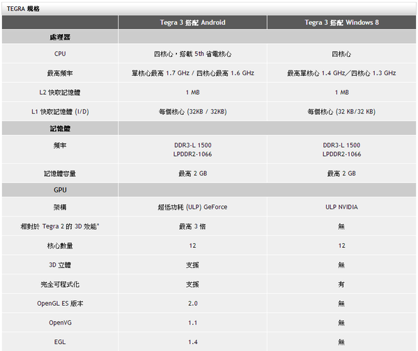搭載 NVIDIA® Tegra® 3 4-Plus-1™ 四核心處理器,內含12顆核心 GPU,智慧核心,聰明節能