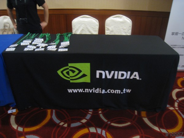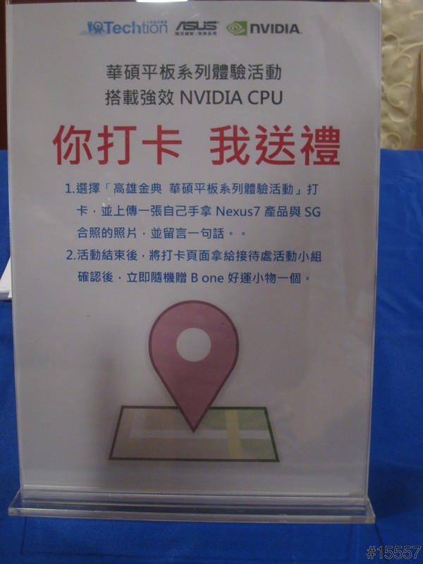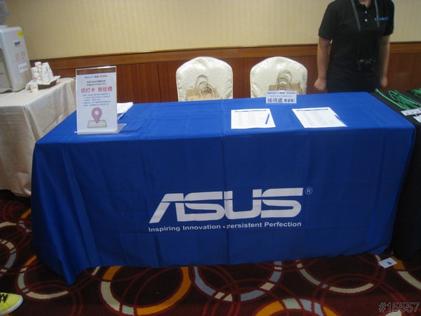 ▲簽到的桌面舖上代表ASUS&NVIDIA的桌布,依舊有你打卡我送禮的好康,但此次遊戲規則有些異動,是要拿著產品與二位美麗的show girl合照並完成上傳,大家依序的排隊與她們完成拍照。