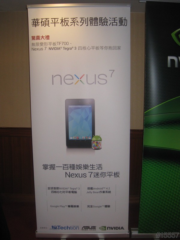 ▲接下來壓軸上場的為全球首款NVIDIA® Tegra ® 3 四核心7 吋平板電腦 Nexus 7,搭載 Android™ 4.1 Jelly Bean 作業系統,高達9.5小時的續航力,配上Super IPS面板亮度提昇1.5倍,並採用Corning® 二代玻璃,不僅更耐用,強度也提升25%,雖然前鏡頭僅120萬畫素,但是卻擁有178゚超廣角,最重要的是Nexus 7為Google自有品牌,所以擁有Google最新的軟體,這是別台平板所望塵莫及,套一句大家常用的話語:麻雀雖小五臟俱全。而且僅僅340g,小巧好攜帶,不管是女生放包包還是男生放西裝外套都很方便,重點是價錢經濟實惠。