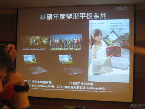 ▲緊接著上場的為主角之一的ASUS無限變形平板 TF700T,搭載著NVIDIA® Tegra® 3 4-Plus-1™ 四核心處理器,聰明節能;又是全球首款擁有高解析度1920x1200 Full HD AndroidTM平板電腦,再配上搭載Super IPS+螢幕增亮技術,即便在戶外使用也不用再擔心;擁有800萬高畫素的後鏡頭再加上200萬畫素的前鏡頭,不管拍遠拍近或者要自拍皆能輕易上手,另外又有F2.2大光圈,不用擔心光線微弱,時時刻刻都可以記錄生活點點滴滴;3C產品最擔心的沒電窘況也毋需太煩惱,因為光平板本身就有9.5小時的續航力,若再加鍵盤基座就有高達14小時的續航力。