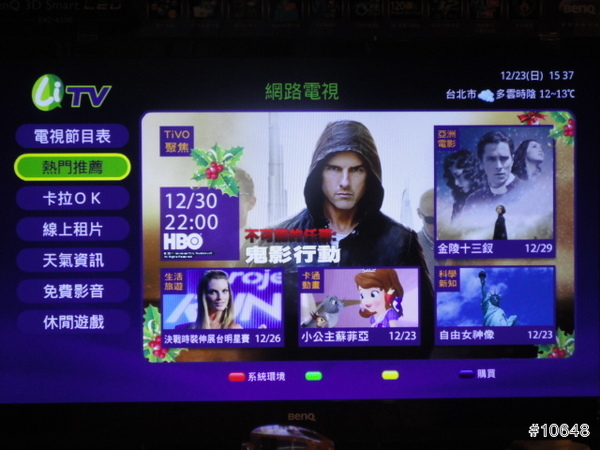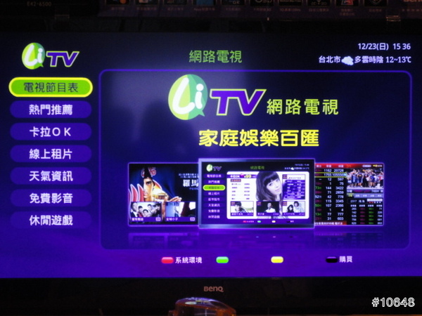 ▼ LiTV影音服務平台,提供熱門節目推薦、電視節目表、氣象資訊、院線預告、熱門MTV、娛樂新聞等多項免費影音服務,還可以享受超值的卡拉OK、線上租片服務及HD高畫質電影等豐富的娛樂影音內容。備註:Li TV部分服務需付費使用。(資料來自BenQ Taiwan官網)