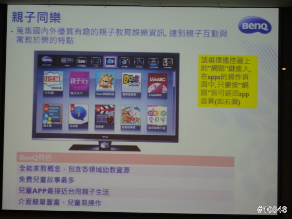 1. BenQ這款智慧型電視的設計重點就放在大量的親子同樂APP, 豐富的各類APP應用如APP軟體市集, 智慧影音分類, 互動電子書與影音娛樂功能, 上網瀏覽功能, 資訊小幫手, 卡拉點唱吧, USB多媒體, PiQture Free雲端相本, Qloud Media 個人雲端分享, 也都讓這款電視的網路應用更多樣化