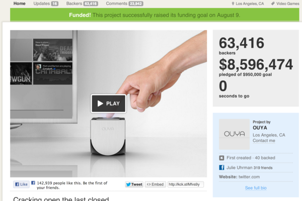 現在你都在哪裡玩遊戲呢?電玩中心?手機上?還是客廳?曾經我們都在客廳的電視上一起玩遊戲的,想想看太空戰士,想想看洛克人,想想看那些陪過你少年時光的好東西。但現在最為蓬勃發展的遊戲卻是各種的休閒遊戲,在手機上玩的、在網頁上的,一些簡單、快速刺激的東西。Ouya 就是為了打破這個局面而生的,它是一款 Android 系統的主機,它送上免費的開發套件,不需要購買昂貴的開發套件以及授權費用,而且使用 Android,開發者都知道這該怎麼辦。現在他們接受獨立募款以發行,目前募集費用已經來到八百五十萬美金,而只要捐款99 美金,就可以獲得一台「Ouya」