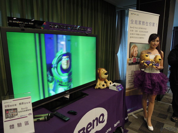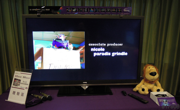 一進會場,就看到漂亮的僮僮小姐站在好大一台BenQ 3D電視旁,BenQ 3D電視正在以播放3D影片,而僮僮小姐手上抱著好可愛的BenQ幸運獅。