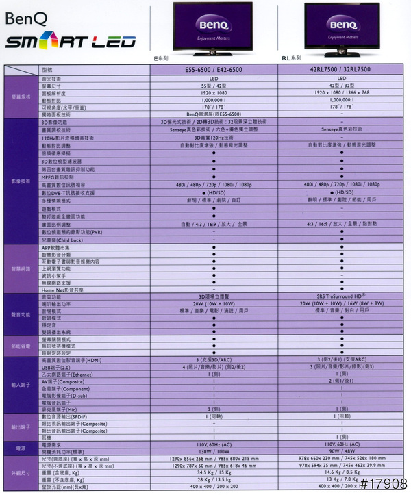 原來BenQ smart TV分為兩款,E系列及RL系列。兩者的差異簡單的說,E系列才有3D功能、有120Hz影片流暢增益技術、有雙打遊戲功能、面板大小是55吋及42吋(55吋才有黑湛屏),而RL系列沒有上述E系列的功能,但是有數位預約錄影及兒童鎖的功能,RL系列的面板大小是42吋及32吋。感覺上E系列是給對電視的功能及畫質要求較高的使用者,而RL系列則是給對規範小朋友看電視及上網習慣特別注重或是特別需要的使用者。