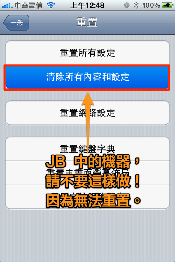 因為,有 JB 的 iPhone 並無法使用這個方法刪除資料,清除後會發生手機停留在無限菊花,而事實上重新開機,資料都還在。