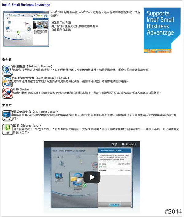 另外還有專為小型企業打造Intel Small Business Advantage (SBA) 解決方案可提供商務導向的資訊安全保護。