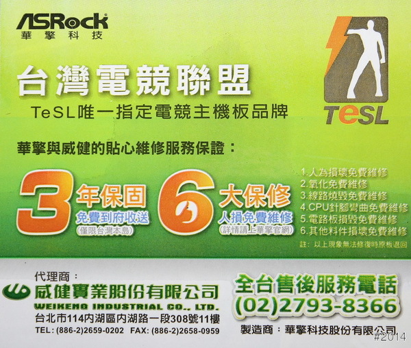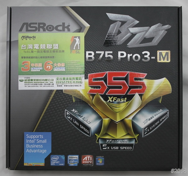 彩盒正面 - 一貫的 555 包裝、台灣電競聯盟 指定主機板,3年保固、6大保修。(威健代理)