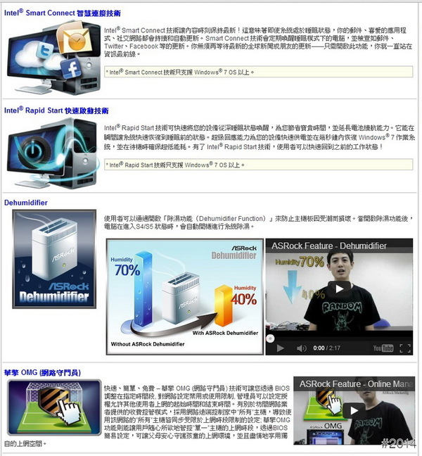 彩盒背面 - 圖示支援相關技術 INTEL HD顯示技術、SBA技術、SRT技術、Smart Connect、Rapid Start、UEFI BIOS及O.M.G等技術等,這次ASRock獨家推出的5倍快的XFast LAN、XFast RAM及XFast USB等有感的555技術。