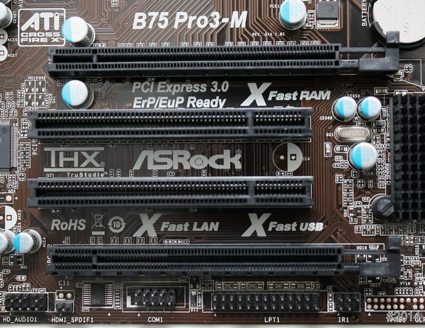 內接裝置區 - 1組PCI-E 3.0 16X、1組PCI-E 2.0 16X 及 2組PCI插槽。提供 3組SATA3(1組B75原生,2組由asmedia提供)、5組SATA2、USB裝置 12組(USB3.0共4組、USB2.0共8組),面板前置端子、HD AUDIO前置面板連接埠。