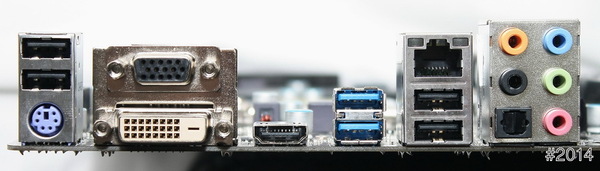 主機板IO區 - 1組PS2鍵盤接頭、1組Gb級網路、2組USB3.0、4組USB2.0、光纖輸出及音效輸出端子,顯示輸出部分有HDMI、DVI及D-SUB各1組。