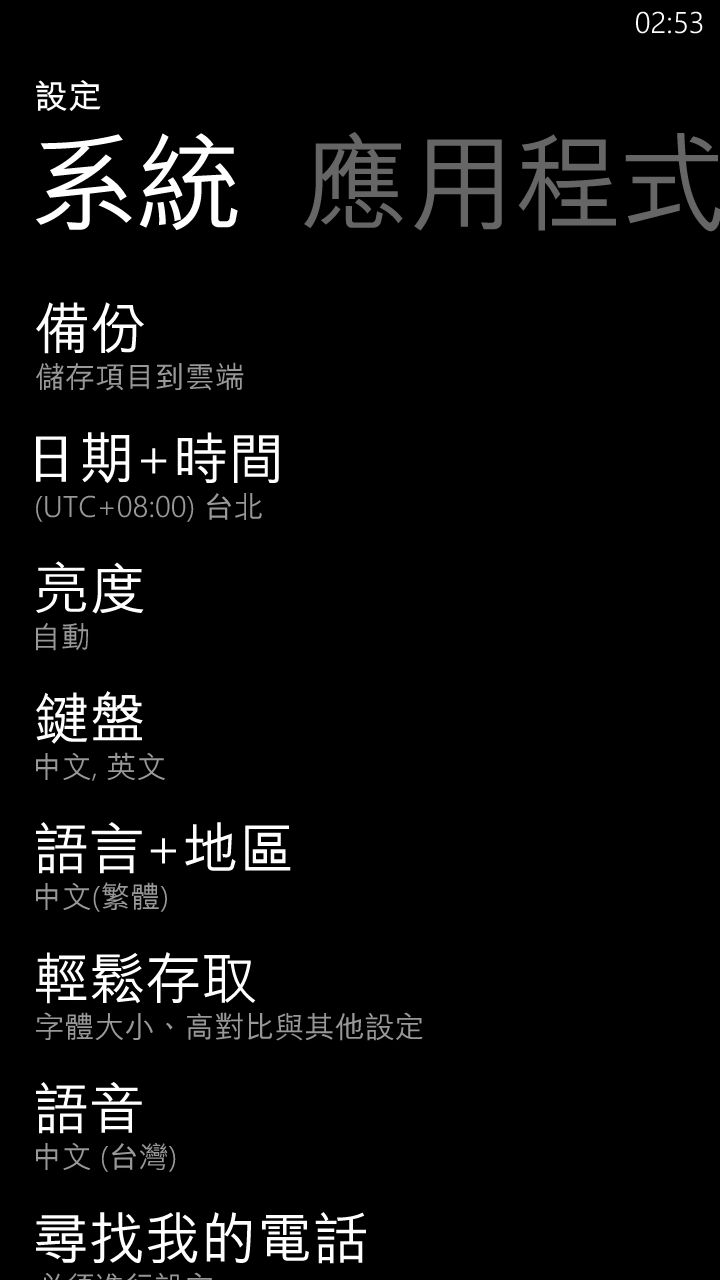 再接著看,有備份、日期+時間、亮度、鍵盤、語言+地區、輕鬆存取、語音、Windows Phone 一直支援的「尋找我的電話」。